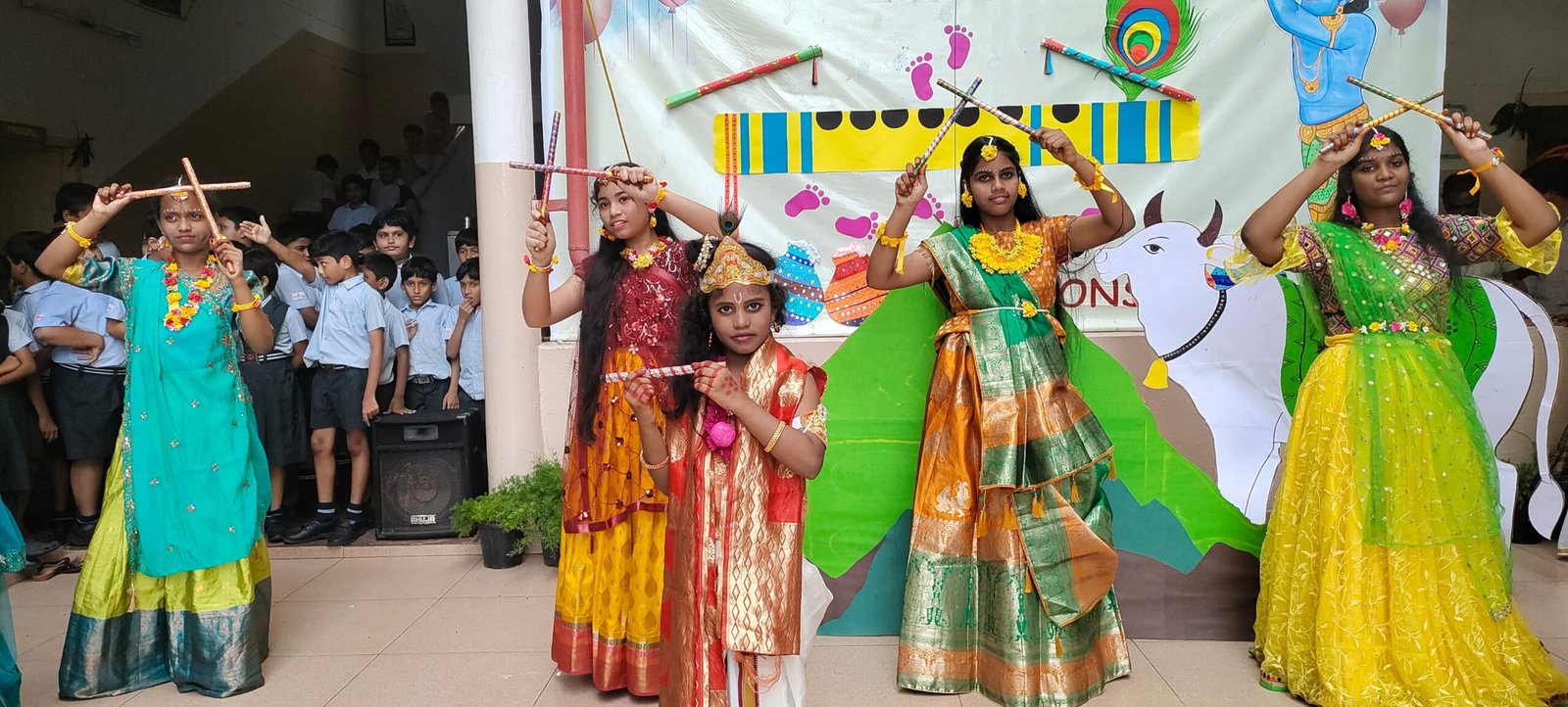 Dual stages are always set for the Janmashtami celebrations for Juniors and Seniors.The Juniors pose as cute Krishnas and Radhas while the Seniors enjoy the Handi breaking and garba dances.